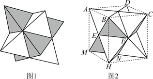 清初著名数学家孔林宗曾提出一种"䓡蒕形多面体", 其可由两个正交的正四面体组合而成, 如图 1, 也可由正方体切割而成, 如图 2. 在图 2 所示的"䒨藜形多面体"中, 若 $A B=2$, 则给出的说法中正确的是 ( )