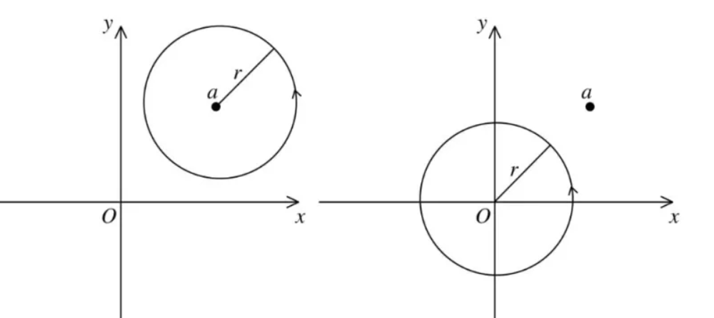 分别沿路径(1)(积分路径是圆心在 $a$ ,半径为 $r$ 的圆,路径的方向为逆时针方向),路径(2)(积分路径是圆心在原点,半径为 $r$ 的圆,路径的方向为逆时针方向)计算积分 $\oint_L \frac{d z}{(z-a)^n}$ .