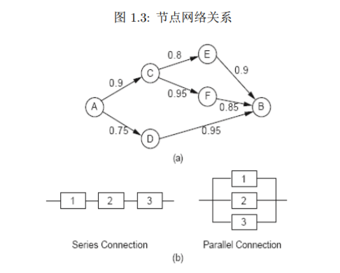 一个计算机网络上的节点 $A, B$ 通过节点 $C, D, E, F$ 连接起来,如图所示。假定任何两个直接相连的节点,记为 $i, j$ ,通路的概率是 $p_{i j}$ 。并假定任何两个连接失效是相互独立的。求 $A, B$ 是通路的概率。