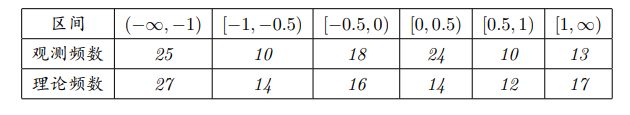 从某连续总体中抽取一个样本量为 100 的样本,发现样本均值和样本标准差分别为 -0.225 和 1.282 ,落在不同区间的频数如下表所示: