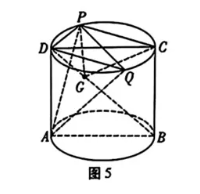 如图 5,圆柱的轴截面为 $A B C D$ ,点 $P, ~ Q$ 为上底面圆周上的两点,已知 $D A=D P=$ $D Q$ ,直线 $D B$ 过 $\triangle A P Q$ 的重心 $G$ .