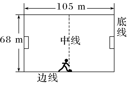 足球比赛中,经常使用“边路突破,下底传中”的战术,即攻方队员带球沿边线前进,到底线附近进行传中,某标准足球场长105 m,宽68 m.攻方前锋在中线处将足球沿边线向前路踢出,足球的运动可视为在地面上做初速度为12 m/s的匀减速直线运动,加速度大小为2 m/s2,试求: