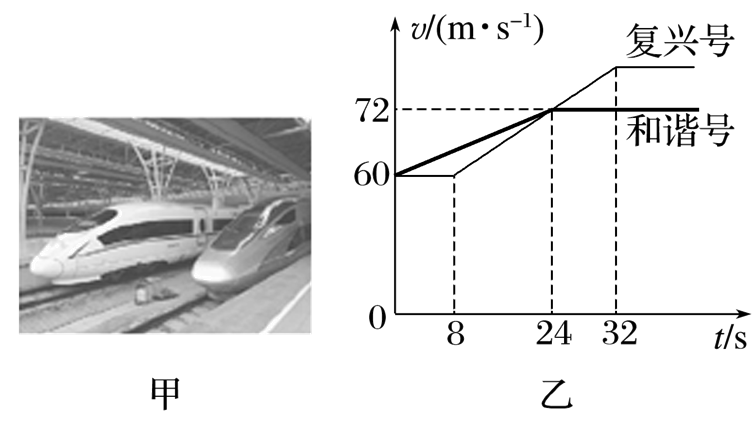 近期,一段特殊的“飙车”视频红遍网络,视频中,一辆和谐号动车正和一辆复兴号动车互相追赶(如图甲).两车并排做直线运动,其v-t图像如图乙所示,t=0时,两车车头刚好并排,则