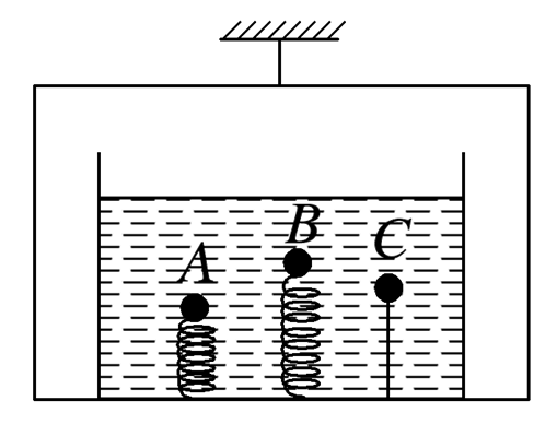 如图所示,A、B、C为三个实心小球,A为铁球,B、C为木球.A、B两球分别连接在两根弹簧上,C球连接在细线一端,弹簧和细线的下端固定在装水的杯子底部,该水杯置于用绳子悬挂的静止吊篮内.若将挂吊篮的绳子剪断,则剪断的瞬间相对于杯底(不计空气阻力,ρ木 < ρ水 < ρ铁)
