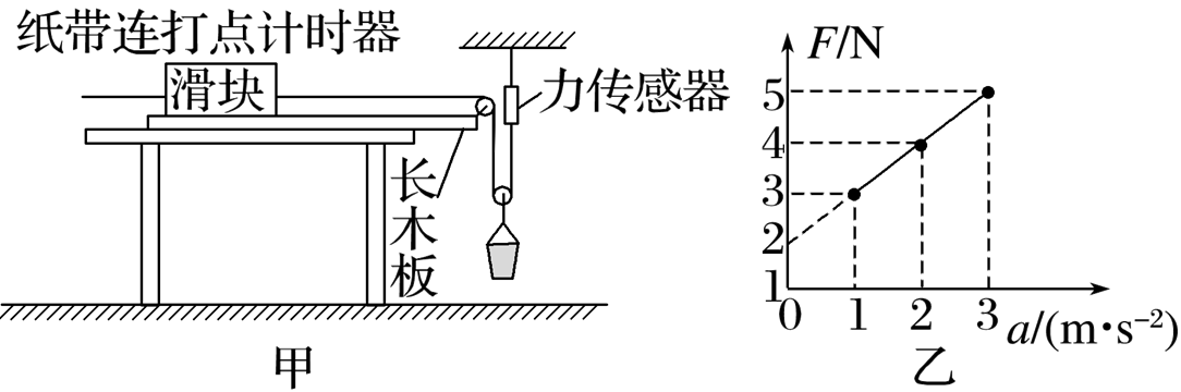 小明利用如图甲所示的实验装置探究加速度与力的关系,滑块放在长木板上,长木板置于水平桌面上,砂桶通过滑轮用细线拉滑块,在细线上接有一个微型力传感器,通过力传感器可以直接读出细线的拉力大小F.保持滑块质量不变,在砂桶中添加少量细砂来改变力传感器的示数F,利用打点计时器打出的纸带求出不同拉力F时对应的加速度a,从而得到如图乙所示的F-a图像.
