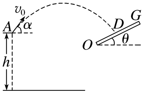 如图所示,在距地面高 $h$ 的 $A$ 点以与水平面成 $\alpha=60^{\circ}$ 的角度斜向上抛出一小球,不计空气阻力.发现小球落在右边板 $O G$ 上,且落点 $D$ 与 $A$ 点等高.已知 $v_0=2 \sqrt{3} m / s , ~ h=0.2 m, ~ g$ 取 $10 m / s ^2$ .则下列说法正确的是