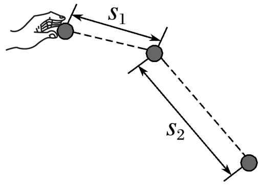 将一小球水平抛出,使用频闪仪和照相机对运动的小球进行拍摄,频闪仪每隔0.05 s发出一次闪光.某次拍摄时,小球在抛出瞬间频闪仪恰好闪光,拍摄的照片编辑后如图所示.图中的第一个小球为抛出瞬间的影像,每相邻两个球之间被删去了3个影像,所标出的两个线段的长度s1和s2之比为3∶7.重力加速度大小取g=10 m/s2,忽略空气阻力.求在抛出瞬间小球速度的大小.