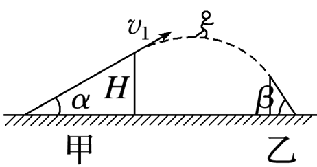 2022年北京冬奥会在北京和张家口举行,北京成为了历史上第一个既举办过夏季奥运会又举办过冬季奥运会的城市.图示为某滑雪运动员训练的场景,运动员以速度v1=10 m/s沿倾角α=37°、高H=15 m的斜面甲飞出,并能无碰撞地落在倾角β=60°的斜面乙上,顺利完成飞越.把运动员视为质点,忽略空气阻力,重力加速度取g=10 m/s2,sin 37°=0.6,cos 37°=0.8.以下说法正确的是