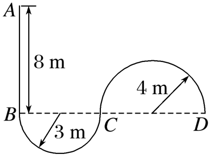 无人配送小车某次性能测试路径如图所示,半径为3 m的半圆弧BC与长8 m的直线路径AB相切于B点,与半径为4 m的半圆弧CD相切于C点.小车以最大速度从A点驶入路径,到适当位置调整速率运动到B点,然后保持速率不变依次经过BC和CD.为保证安全,小车速率最大为4 m/s,在ABC段的加速度最大为2 m/s2,CD段的加速度最大为1 m/s2.小车视为质点,小车从A到D所需最短时间t及在AB段做匀速直线运动的最长距离l为