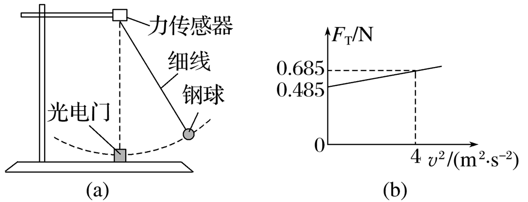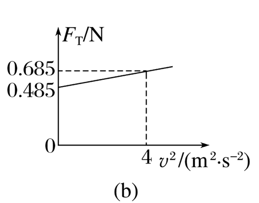 (4)改变小球通过光电门的速度,重复实验,测出多组速度v和对应拉力FT的数据,作出FT-v2图像如图(b)所示.已知当地重力加速度g=9.7 m/s2,则由图像可知,小球的质量为 ________ kg,光电门到悬点的距离为 ________ m.