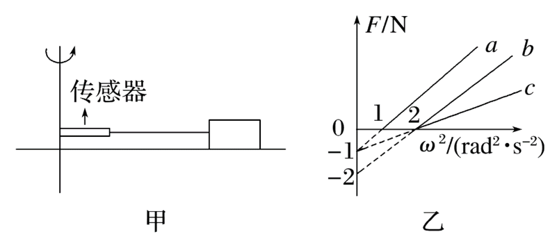 如图甲所示,某同学为了比较不同物体与转盘间动摩擦因数的大小设计了该装置.已知固定于转轴上的角速度传感器和力传感器与电脑连接,通过一不可伸长的细绳连接物块,细绳刚好拉直,物块随转盘缓慢加速.在电脑上记录如图乙所示图像.换用形状和大小相同但材料不同的物块重复实验,得到物块a、b、c分别对应的三条直线,发现a与c的纵截距相同,b与c的横截距相同,且符合一定的数量关系.回答下列问题:
