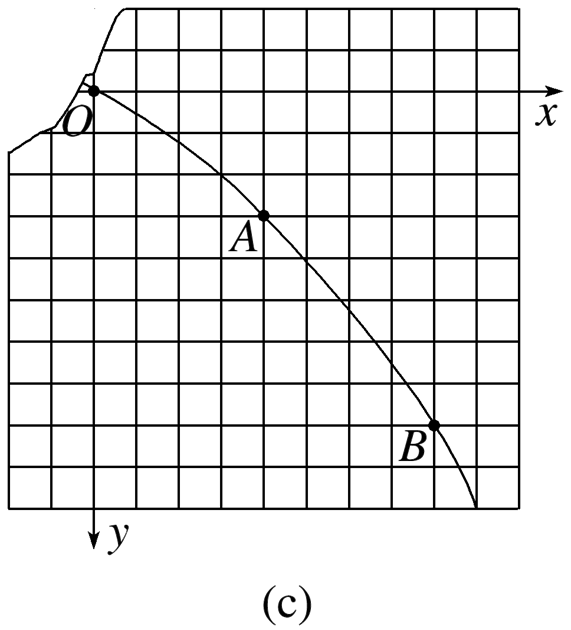 (3)乙同学不小心将记录实验的坐标纸弄破损,导致平抛运动的初始位置缺失.他选取轨迹中任意一点O为坐标原点,建立xOy坐标系(x轴沿水平方向、y轴沿竖直方向),如图(c)所示.在轨迹中选取A、B两点,坐标纸中每个小方格的边长仍为L,重力加速度为g.由此可知:小球从O点运动到A