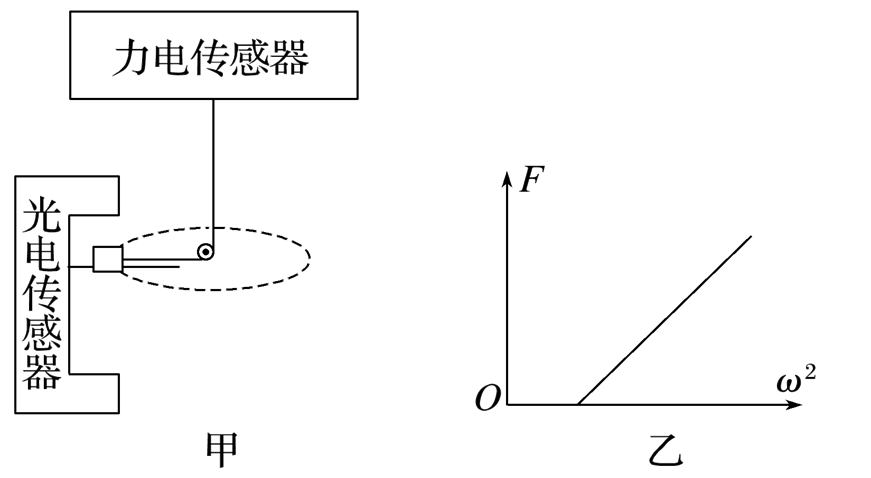 (2)小明按上述实验将测算得的结果用作图法来处理数据,如图乙所示,纵轴F为力传感器读数,横轴为ω2,图线不过坐标原点的原因是 ________ ,用电子天平测得物块质量为1.50 kg,直尺测得半径为50.00 cm,图线斜率为 ________ kg·m(结果保留两位有效数字).