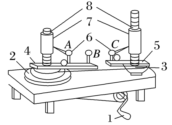 .如图所示为向心力演示装置,匀速转动手柄1,可以使变速塔轮2和3以及长槽4和短槽5随之匀速转动,槽内的小球也随着做匀速圆周运动.使小球做匀速圆周运动的向心力由横臂6的挡板(即挡板A、B、C)对小球的压力提供.球对挡板的反作用力通过横臂的杠杆作用使弹簧测力套筒7下降,从而露出标尺8.根据标尺8上露出的红白相间等分标记,可以粗略计算出两个球做圆周运动所需的向心力的比值.利用此装置可以探究做匀速圆周运动的物体需要的向心力的大小与哪些因素有关.已知小球在挡板A、B、C处做圆周运动的轨迹半径之比为1∶2∶1.