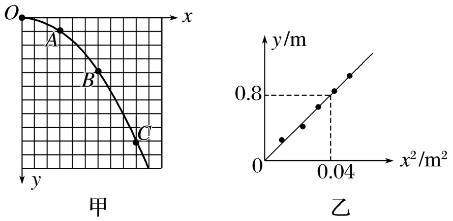 (3)该同学在轨迹上选取间距较大的几个点,测出其坐标,并在直角坐标系内绘出了y-x2图像(如图乙),此平抛运动中钢球的初速度v0=0.49 m/s,则竖直方向的加速度g= m/s2.(结果保留3位有效数字)