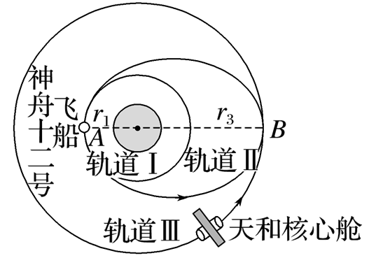 2021年6月17日,神舟十二号载人飞船与天和核心舱完成对接,航天员聂海胜、刘伯明、汤洪波进入天和核心舱,标志着中国人首次进入了自己的空间站.对接过程的示意图如图所示,天和核心舱处于半径为r3的圆轨道Ⅲ;神舟十二号飞船处于半径为r1的圆轨道Ⅰ,运行周期为T1,通过变轨操作后,沿椭圆轨道Ⅱ运动到B处与天和核心舱对接.则神舟十二号飞船