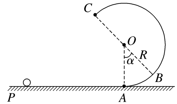如图,在竖直平面内,一半径为R的光滑圆弧轨道ABC和水平轨道PA在A点相切,BC为圆弧轨道的直径,O为圆心,OA和OB之间的夹角为α,sin α= .一质量为m的小球沿水平轨道向右运动,经A点沿圆弧轨道通过C点,落至水平轨道;在整个过程中,除受到重力及轨道作用力外,小球还一直受到一水平恒力的作用,已知小球在C点所受合力的方向指向圆心,且此时小球对轨道的压力恰好为零.重力加速度大小为g.求: