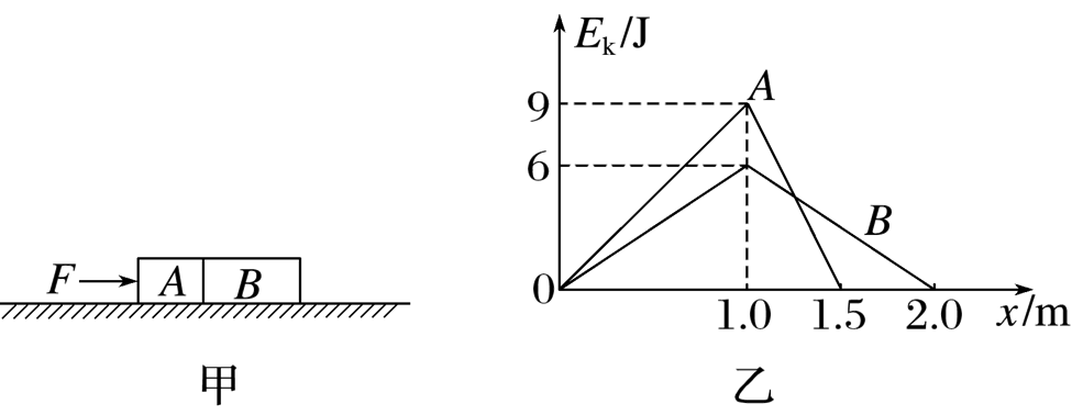 如图甲所示,两个不同材料制成的滑块A、B静置于水平桌面上,滑块A的右端与滑块B的左端接触.某时刻开始,给滑块A一个水平向右的力F,使滑块A、B开始滑动,当滑块A、B滑动1.0 m时撤去力F.整个运动过程中,滑块A、B的动能Ek随位移x的变化规律如图乙所示.不计空气阻力,求: