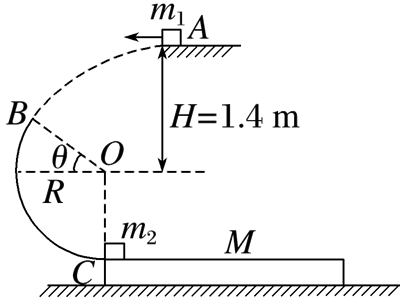 如图所示,半径R=1.0 m的粗糙圆弧轨道固定在竖直平面内,轨道的上端点B和圆心O的连线与水平方向间的夹角θ=37°,下端点C为轨道的最低点.C点右侧的粗糙水平面上,紧挨C点静止放置一质量M=1 kg的木板,木板上表面与C点等高,木板左端放置一个质量为m2=1 kg的物块,另一质量为m1=1 kg的物块从A点以某一速度水平抛出,恰好从轨道的B端沿切线方向进入轨道,到达C点时对轨道的压力大小为46 N,之后与质量为m2的物块发生弹性碰撞(碰撞时间极短),最终质量为m2的物块刚好未从木板上滑下.已知AO的竖直高度H=1.4 m,质量为m2的物块与木板间的动摩擦因数μ1=0.4,木板与地面间的动摩擦因数为μ2=0.1,两物块相同且均可视