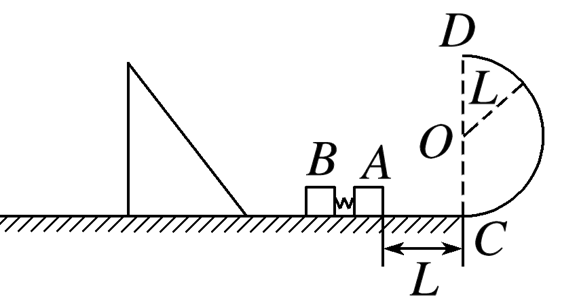 如图所示,水平面上有A、B两个小物块(均视为质点),质量均为m,两者之间有一被压缩的轻质弹簧(未与A、B连接).距离物块A为L处有一半径为L的固定光滑竖直半圆形轨道,半圆形轨道与水平面相切于C点,物块B的左边静置着一个三面均光滑的斜面体(底部与水平面平滑连接).某一时刻将压缩的弹簧释放,物块A、B瞬间分离,A向右运动恰好能过半圆形轨道的最高点D(过D点后立即撤去物块A),B向左平滑地滑上斜面体,在斜面体上上升的最大高度为L(L小于斜面体的高