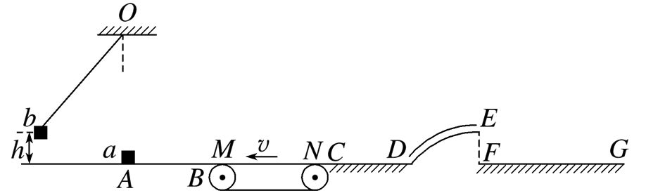 如图所示,在竖直面内,一质量m的物块a静置于悬点O正下方的A点,以速度v逆时针转动的传送带MN与直轨道AB、CD、FG处于同一水平面上,AB、MN、CD的长度均为l.圆弧形细管道DE半径为R,EF在竖直直径上,E点高度为H.开始时,与物块a相同的物块b悬挂于O点,并向左拉开一定的高度h由静止下摆,细线始终张紧,摆到最低点时恰好与a发生弹性正碰.已知m=2 g,l=1 m,R=0.4 m,H=0.2 m,v=2 m/s,物块与MN、CD之间的动摩擦因数μ=0.5,轨道AB和管道DE均光滑,物块a落到FG时不反弹且静止.忽略M、B和N、C之间的空隙,CD与DE平滑连接,物块可视为质点,取g=10 m/s2.
