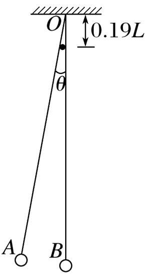如图所示,两个摆长均为L的单摆,摆球A、B质量分别为m1、m2,悬点均为O.在O点正下方0.19L处固定一小钉.初始时刻B静止于最低点,其摆线紧贴小钉右侧,从图示位置由静止释放A(θ足够小),在最低点与B发生弹性正碰.两摆在整个运动过程中均满足简谐运动条件,摆线始终保持绷紧状态且长度不变,摆球可视为质点,不计碰撞