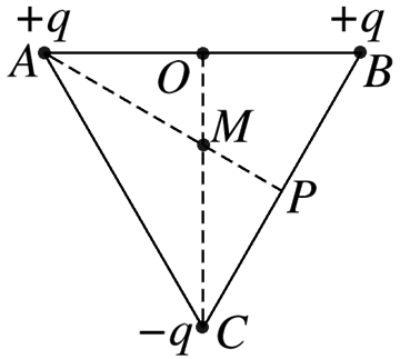 如图所示,在等边三角形三个顶点A、B、C处,固定电荷量分别为+q、+q、-q的三个点电荷,过点C作AB边的垂线,垂足为O,过点A作BC边的垂线,垂足为P,两垂线交于M点.取无穷远处电势为零,则下列说法正确的是