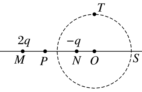 如图,真空中电荷量为2q和-q(q>0)的两个点电荷分别位于M点与N点,形成一个以MN延长线上O点为球心,电势为零的等势面(取无穷远处电势为零),P为MN连线上的一点,S为等势面与直线MN的交点,T为等势面上的一点,下列说法正确的是
