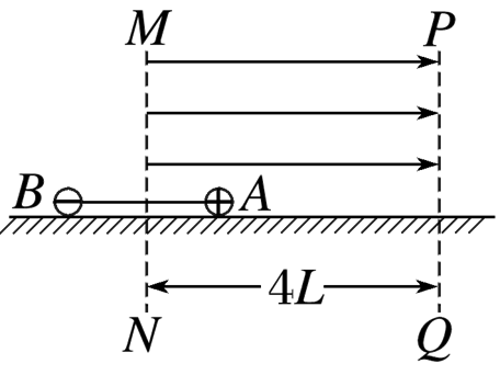 在光滑绝缘的水平面上,长为2L的绝缘轻质细杆的两端各连接一个质量均为m的带电小球A和B(均可视为质点)组成一个带电系统,球A所带的电荷量为+2q,球B所带的电荷量为-3q.现让A处于如图所示的有界匀强电场区域MNQP内,已知虚线MN位于细杆的中垂线,MN和PQ的距离为4L,匀强电场的电场强度大小为E、方向水平向右.释放带电系统,让A、B从静止开始运动,不考虑其他因素的影响.求: