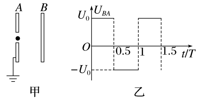 如图甲所示,$A 、 B$ 两极板间加上如图乙所示的交变电压,$A$ 板的电势为 0 ,一质量为 $m$ 、电荷量大小为 $q$ 的电子仅在静电力作用下,在 $t=\frac{T}{4}$ 时刻从 $A$ 板的小孔处由静止释放进入两极板间运动,恰好到达 $B$ 板,则