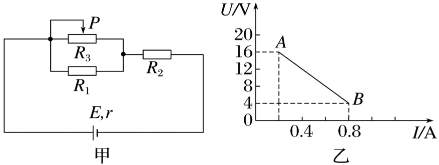 在如图甲所示的电路中,R1、R2均为定值电阻,且R1=100 Ω,R2阻值未知,R3是一滑动变阻器,当其滑片P从最左端滑至最右端时,测得电源的路端电压随电源中流过的电流的变化图线如图乙所示,其中A、B两点是滑片P在变阻器的两个不同端点得到的.求:
