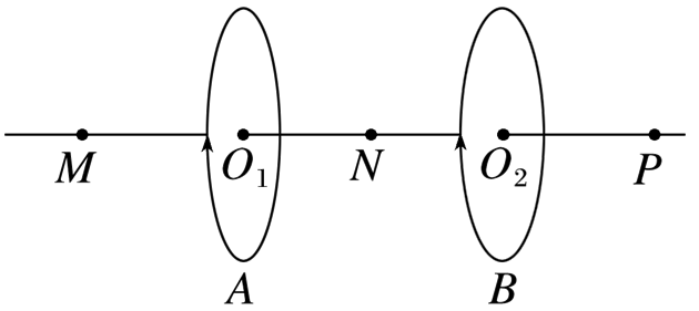 如图,两形状完全相同的平行金属环 $A 、 B$ 坚直固定在绝缘水平面上,且两圆环的圆心 $O_1 、 O_2$ 的连线为一条水平线,其中 $M 、 N 、 P$ 为该连线上的三点,相邻两点间的距离满足 $M O_1=O_1 N=N O_2=O_2 P$ 。当两金属环中通有从左向右看逆时针方向的大小相等的电流时,经测量可得 $M$ 点的磁感应强度大小为 $B_1 、 N$ 点的磁感应强度大小为 $B_2$ ,如果将右侧的金属环 $B$ 取走,$P$ 点的磁感应强度大小应为