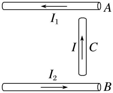光滑水平面内固定两根平行的长直导线A和B,通以等大反向的电流I1、I2;通有图示方向电流I的短导线C垂直于A、B放在正中间,三者处于同一平面内.释放C,它将