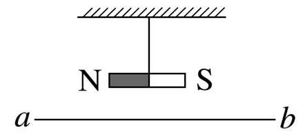 如图所示,用细线将一条形磁体挂于天花板上,磁体处于水平且静止的状态,条形磁体的正下方固定一直导线ab,现将直导线中通入由a指向b的电流,在磁体转动90°的过程中,下列说法正确的是