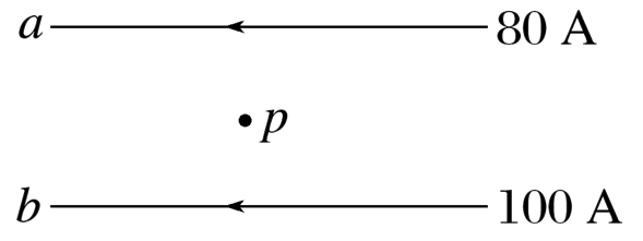 如图所示,有两根用超导材料制成的长直平行细导线a、b,分别通以80 A和100 A流向相同的电流,两导线构成的平面内有一点p,到两导线的距离相等.下列说法正确的是