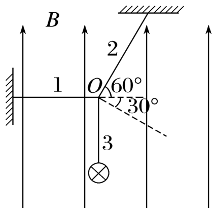 如图所示,竖直平面内有三根轻质细绳,绳1水平,绳2与水平方向成60°角,O为结点,绳3的下端拴接一质量为m、长度为l的导体棒,棒垂直于纸面静止,整个空间存在竖直向上、磁感应强度大小为B的匀强磁场.现向导体棒通入方向向里、大小由零缓慢增大到I0的电流,可观察到导体棒缓慢上升到与绳1所处的水平面成30°角时保持静止.已知重力加速度为g.在此过程中,下列说法正确的是