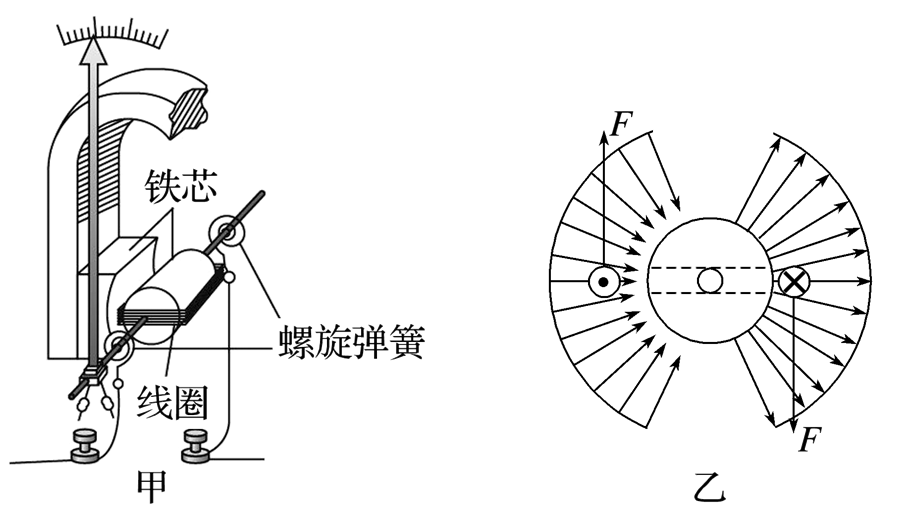 如图甲所示是磁电式电表内部结构示意图,蹄形磁体的两极间有一个固定的圆柱形铁芯,铁芯外面套有一个可以绕轴转动的铝框,在铝框上绕有铜线圈.电表指针固定在铝框上,可与线圈一起转动,线圈的两端分别接在两个螺旋弹簧上,被测电流经过这两个弹簧流入线圈.蹄形磁体与铁芯间的磁场可看作是均匀辐射分布的,如图乙所示,无论线圈转到什么位置,线圈平面总与线圈所在磁场的方向平行.关于磁电式电表,