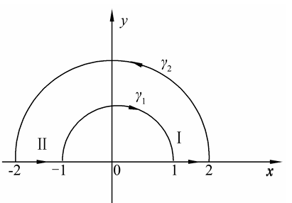 设 $\Gamma$ 是闭圆环 $1 \leqslant|z| \leqslant 2$ 上半部分的边界,其方向如图 3.2 所示.则复积分