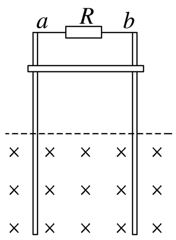 两根足够长的光滑导轨坚直放置,间距为 $L$ ,顶端接阻值为 $R$ 的电阻.质量为 $m$ 、电阻为 $r$ 的金属棒在距磁场上边界某处由静止释放,金属棒和导轨接触良好,导轨所在平面与磁感应强度大小为 $B$ 、方向垂直纸面向里的匀强磁场垂直,如图所示.不计导轨的电阻,重力加速度为 $g$ ,则下列说法正确的是