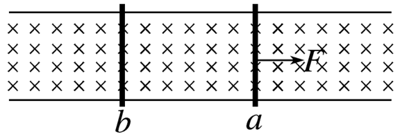 如图所示,在两光滑水平金属导轨上静止放置 $a 、 b$ 两根导体棒,整个装置处于坚直向下的匀强磁场中,用水平恒力 $F$ 拉动 $a$ 棒,在运动过程中,$a 、 b$ 棒始终与导轨接触良好,若不计导轨电阻,下列说法正确的是
