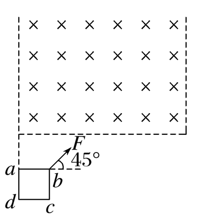 如图所示,高度足够的匀强磁场区域下边界水平、左右边界坚直,磁场方向垂直于纸面向里.正方形单匝线框 $a b c d$ 的边长 $L=$ 0.2 m 、回路电阻 $R=1.6 \times 10^{-3} \Omega$ 、质量 $m=0.2 kg$ 。线框平面与磁场方向垂直,线框的 $a d$ 边与磁场左边界平齐,$a b$ 边与磁场下边界的距离也为 $L$ 。现对线框施加与水平向右方向成 $\theta=45^{\circ}$ 角、大小为 $4 \sqrt{2} N$ 的恒力 $F$ ,使其在图示坚直平面内由静止开始运动.从 $a b$ 边进入磁场开始,在坚直方向线框做匀速运动;$d c$ 边进入磁场时,$b c$ 边恰好到达磁场右边界.重力加速度大小取 $g=10 m / s ^2$ ,求: