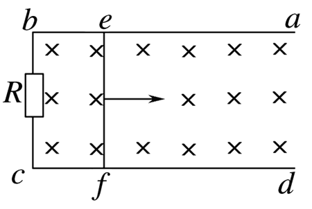 如图所示,在一匀强磁场中有一U形导线框 $a b c d$ ,线框处于水平面内,磁场与线框平面垂直,$R$ 为一电阻,$e f$ 为垂直于 $a b$ 的一根导体杆,它可在 $a b 、 c d$ 上无摩擦地滑动.杆 $e f$ 及线框的电阻不计,开始时,给 $e f$ 一个向右的初速度,则