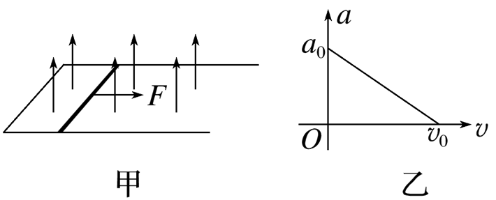 如图甲所示,两间距为 $L$ 的平行光滑金属导轨固定在水平面内,左端用导线连接,导轨处在坚直向上的匀强磁场中,一根长度也为 $L$ 、电阻为 $R$的金属棒放在导轨上,在平行于导轨向右、大小为 $F$ 的恒力作用下向右运动,金属棒运动过程中,始终与导轨垂直并接触良好,金属棒运动的加速度与速度关系如图乙所示,不计金属导轨及左边导线电阻,金属导轨足够长,若图乙中的 $a_0 、 v_0$ 均为已知量,