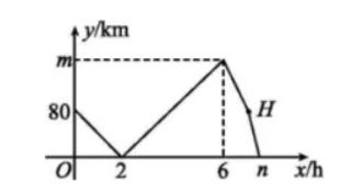 甲、乙两车从 $A$ 地出发,匀速驶向 $B$ 地.甲车以 80 $km / h$ 的速度行驶 1 h 后,乙车才沿相同路线行驶.乙车先到达 $B$ 地并停留 1 h 后,再以原速按原路返回,直至与甲车相遇。在此过程中,两车之间的距离 $y(km)$ 与乙车行驶时间 $x(h)$ 之间的函数关系如图所示。下列说法:(1)乙车的速度是 $120 km / h$ ;(2)$m=160$ ;(3)点 $H$ 的坐标是 $(7,80)$ ;(4)$n=7.5$ .其 中说法正确的有