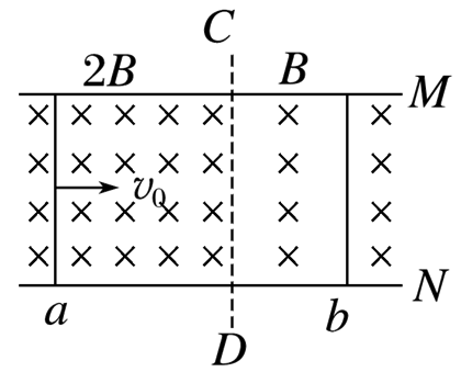 如图,足够长的平行光滑金属导轨 $M 、 N$ 固定在水平桌面上,导轨间距离为 $L$ ,垂直导轨平面有坚直向下的匀强磁场,以 $C D$ 为分界线,左边磁感应强度大小为 $2 B$ ,右边为 $B$ ,两导体棒 $a 、 b$ 垂直导轨静止放置,$a$ 棒距 $C D$ 足够远,已知 $a$ 、 $b$ 棒质量均为 $m$ 、长度均为 $L$ 、电阻均为 $r$ ,棒与导轨始终接触良好,导轨电阻不计,现使 $a$ 获得一瞬时水平速度 $v_0$ ,在两棒运动至稳定的过程中 $(a$棒还没到 $C D$ 分界线),下列说法正确的是