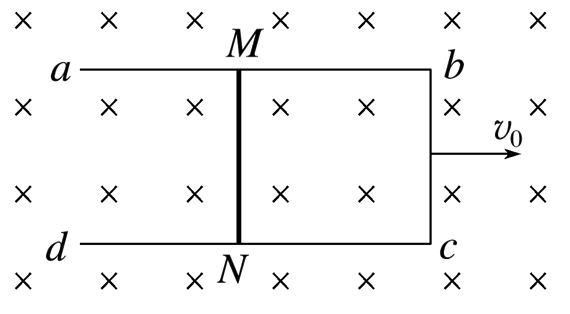 如图所示,一质量为2m的足够长U形光滑金属框abcd置于水平绝缘平台上,bc边长为L,不计金属框电阻.一长为L的导体棒MN置于金属框上,导体棒的阻值为R、质量为m.装置处于磁感应强度为B、方向竖直向下的匀强磁场中.现给金属框水平向右的初速度v0,在整个运动过程中MN始终与金属框保持良好接触,则 A.刚开始运动时产生的感应电流方向为M→N→c→b→M