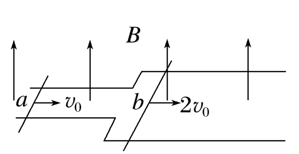 如图所示,空间存在竖直向上的匀强磁场,磁感应强度大小为B,足够长的光滑平行金属导轨水平放置,导轨左右两部分的间距分别为l、2l;质量分别为m、2m 的导体棒a、b均垂直导轨放置,导体棒a接入电路的电阻为R,其余电阻均忽略不计;a、b两棒分别以v0、2v0的初速度同时向右运动,两棒在运动过程中始终与导轨垂直且保持良好接触,a 总在窄轨上运动,b总在宽轨上运动,直到两棒达到稳定状态,从开始运动到两棒稳定的过程中,