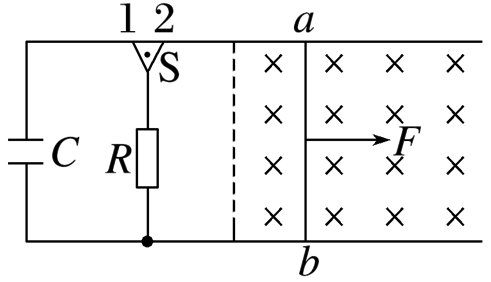 如图,相距为L的两光滑平行金属导轨固定在绝缘水平桌面上,左端接一电容器C,阻值为R的电阻通过三角旋钮开关S与两导轨连接,长度为L、质量为m的金属杆ab垂直导轨放置,且与导轨始终接触良好,两导轨间存在垂直导轨平面向下的匀强磁场,磁感应强度大小为B.三角旋钮开关S仅1、2之间导电,S左旋时能将电阻R和电容器C接入同一回路,右旋时能将电阻R和金属杆ab接入同一回路,初始时1、2连接电容器和金属杆,现用恒力F向右拉金属杆ab,使其从静止开始运动,经一段时间后撤去F,同时旋转S,此时金属杆的速度大小为v0,不计金属杆和导轨的电阻.