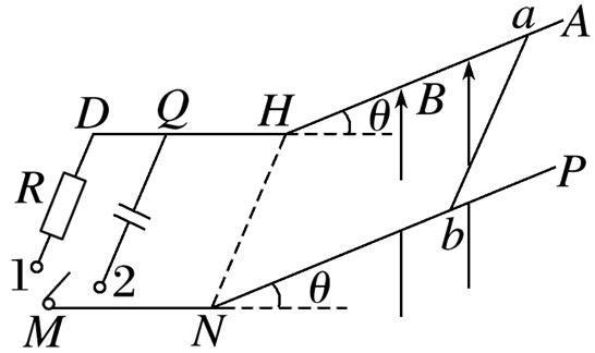 如图所示,平行金属导轨AHQD、PNM上放置有一导体棒 $a b$ ,导轨倾斜部分置于坚直向上、磁感应强度大小为 $B$ 的匀强磁场中,导轨 $A H Q D$ 水平部分通过导线分别连接有电容器(电容为 $C$ )和定值电阻 (阻值为 $R$ ),导轨 $M$ 端接有一单刀双掷开关,导轨间距为 $L$ ,导轨倾斜部分的倾角为 $\theta$ ,导体棒与导轨间的动摩擦因数为 $\mu(\mu < \tan \theta)$ ,导体棒质量为 $m$ ,导轨、导体棒和导线的电阻忽略不计,重力加速度 $g=$ $10 m / s ^2$ .现在离 $H N$ 足够远处由静止释放导体棒 $a b$ ,导体棒可沿导轨向下运动,导体棒始终与导轨垂直且接触良好,则