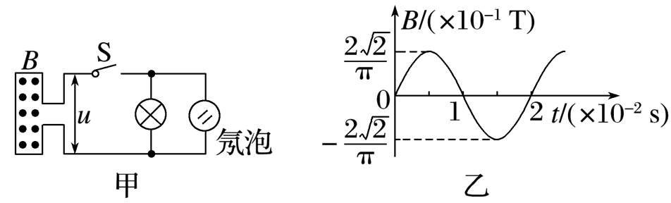 如图甲所示,电阻不计、面积 $S=0.04 m^2$ 的固定矩形线圈水平放置,与线圈平面垂直的空间有均匀分布的匀强磁场,磁场的磁感应强度随时间变化的规律如图乙所示.此时与线圈连接的额定电压是 40 V 的灯泡正常发光,氖泡两端瞬时电压达到 40 V 时开始发光.下列说法正确的是(不计灯丝电阻随温度的变化)
